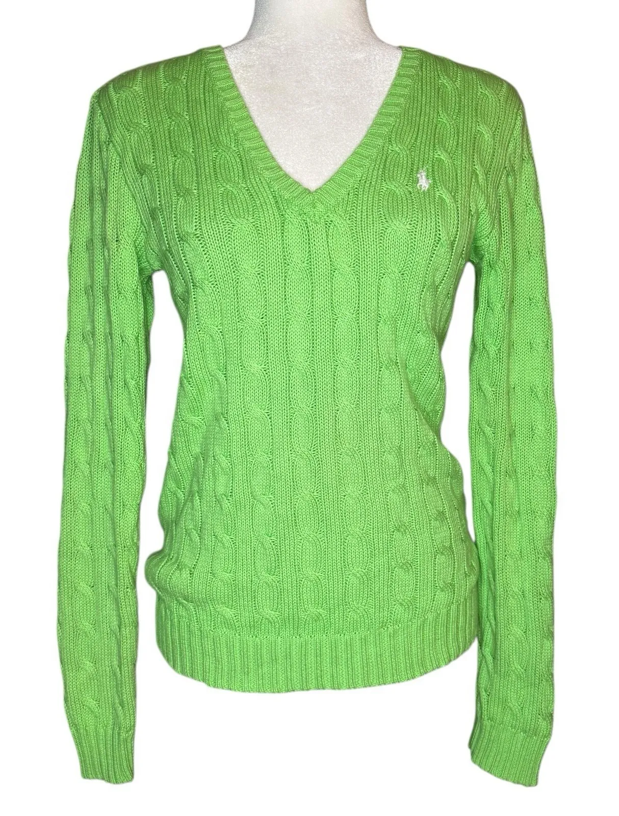 Polo Ralph Lauren women's classic cable knit V-neck sweater in a vibrant Kelly green, size Small. Cr... Show more