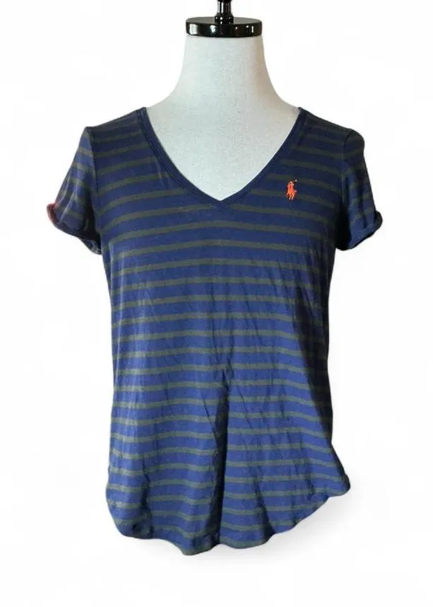 Polo Ralph Lauren women's striped V-neck tee shirt. Classic navy and olive green horizontal stripes... Show more