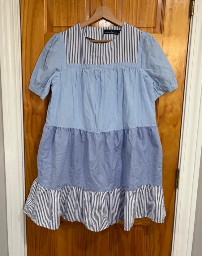 Soft and feminine Pomander Place babydoll dress featuring a tiered silhouette, puff sleeves, and mixed stripe detailing. Easy, flowy fit with a relaxed cottagecore / coastal vibe — perfect for spring and summer wear. Details: Brand: Pomander Place Size: Women’s M Color: Light blue with navy/white stripes Style: Babydoll / tiered dress Short puff sleeves Pull-on style Lightweight woven fabric Condition: New without tags. Dress has a small woven-in mark in the fabric (not a stain; appears to be part of the weave/manufacturing flaw). No other flaws noted. Please see close-up photo.