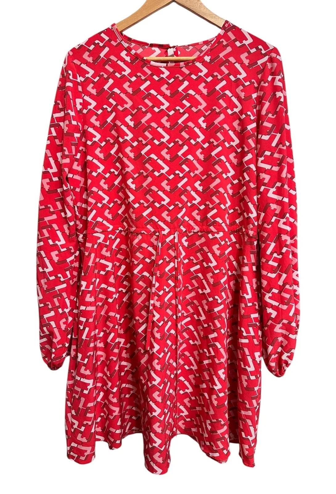 Pre-owned. No flaws. Smoke free home. Pomander Place red dress with an allover geometric print. This dress features long sleeves and a flattering cinched waist with subtle pleating. The fabric is a blend designed for comfort and drape. Style: Shift, A-Line, Fit & Flare Department: Women Sleeve Length: Long Sleeve Pattern: Geometric Occasion: Casual, Party/Cocktail Material: Polyester, Spandex Fabric Type: Chiffon Neckline: Round Neck Season: Spring, Summer Sleeve Type: Balloon Sleeve Closure: Pullover Keywords: Pomander Place dress, geometric print, sheath dress, red dress, long sleeve dress, midi dress, fall dress, workwear, casual dress, printed dress, plus size dress, statement dress