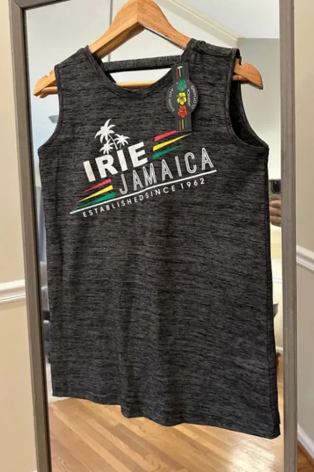 This is a new, sleeveless tank top from Show Off Jamaica Clothing. It is a charcoal gray color with a heather-like texture. The tank top features a V-neckline and a low back. It has a graphic print on the front that says "Irie Jamaica Established Since 1962" with palm trees and the Jamaican flag colors. The tank top is made of a soft, comfortable fabric and is perfect for casual wear. It is in new condition with tags and comes in a size small. The tank top measures approximately 25 inches in length and 18 inches in width. The tank top is in new condition with tags and is ready to be worn.