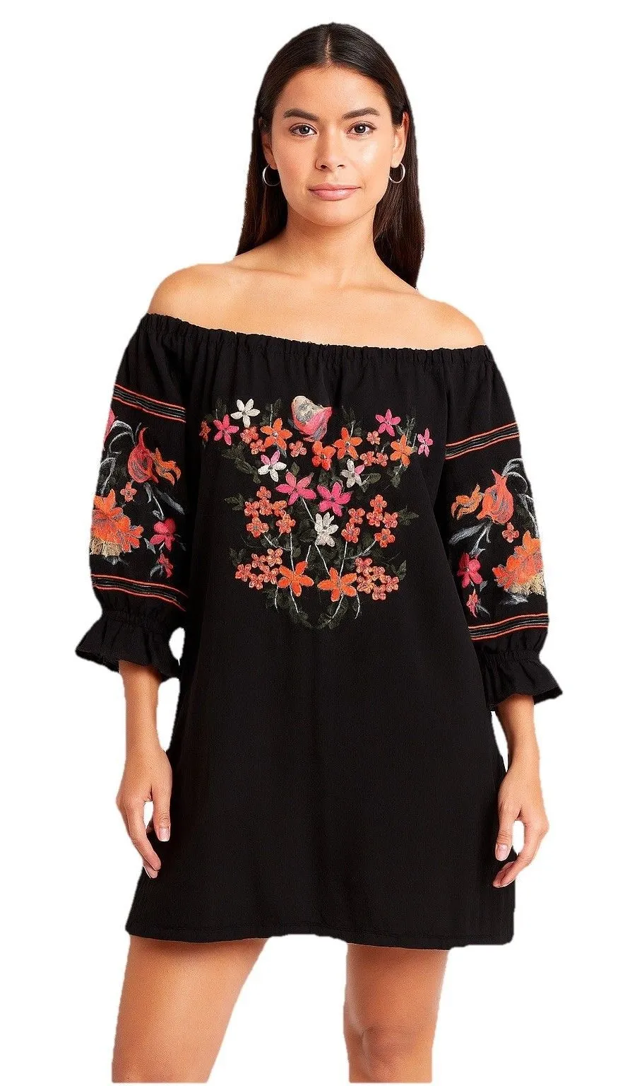 Poof 100% cotton tunic /mini dress with beautiful bold colored floral embroidery Off the shoulder s... Show more