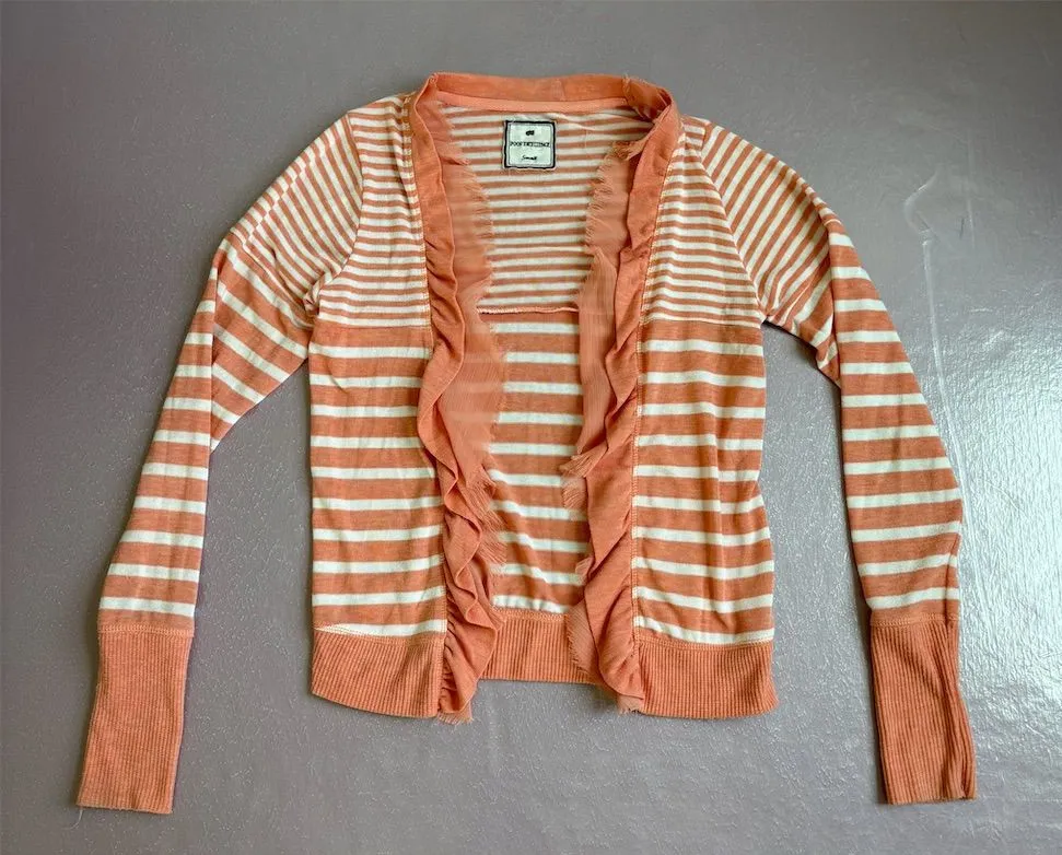 Wrap yourself in the cozy charm of the Poof Girl cardigan, a delightful addition to your fall wardrobe. This orange striped sweater, crafted from a soft blend of cotton and rayon, offers a regular fit that feels just right. The open front design, adorned with playful ruffles, adds a touch of whimsy to your casual outings. Perfect for layering, this knit cardigan is your go-to for those crisp autumn days. Plus, it's machine washable, making it as practical as it is stylish. This piece is pre-owned, adding a unique story to your style. Brand: Poof Girl Size: S Style: Cardigan Color: Orange Department: Women