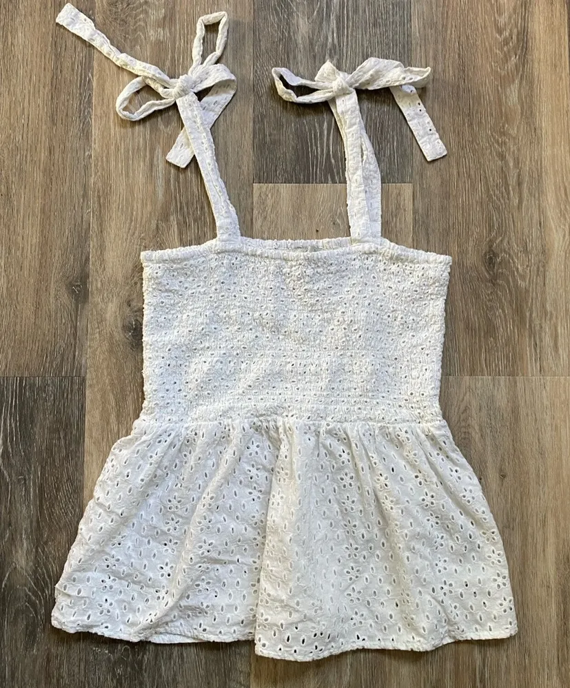 Add a touch of romantic Y2K style with this Poof! white eyelet lace babydoll top. Featuring ribbon b... Show more