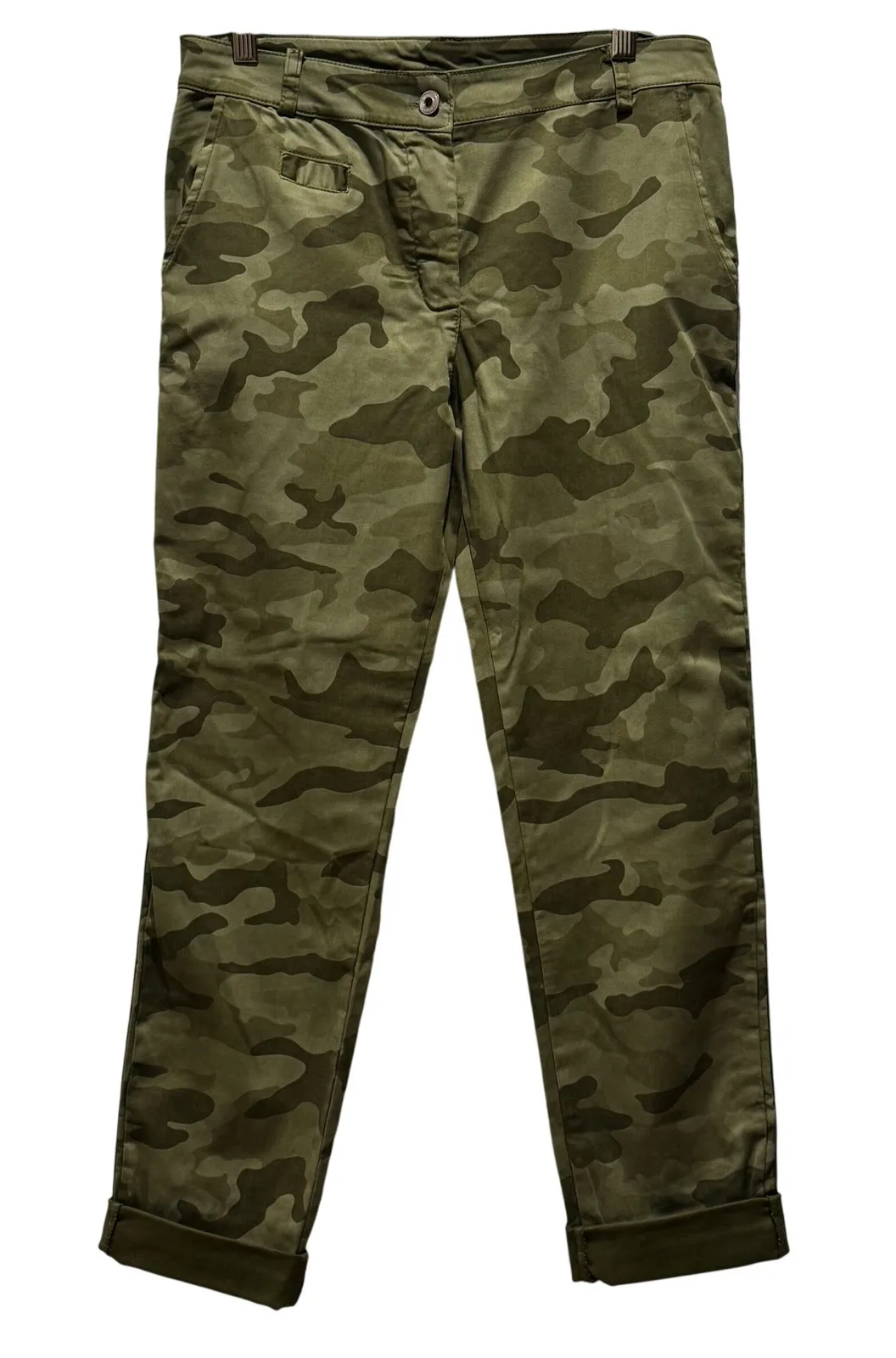 Pookie & Sebastian women's cargo pants in a green camouflage print. These pants feature a cropped length with a cuffed hem, offering a stylish and modern silhouette. Detailed with practical pockets and a comfortable fit, they are perfect for casual outings or outdoor adventures. From 1997 Measurements: • Inseam 25" • Waist flat 15" • Rise 10" Style: Chino Department: Women Material: Polyester Leg Style: Tapered Fabric Type: Twill Type: Pants Features: Pockets, Cuffed, Stretch, Lightweight, Easy Care Closure: Button Pattern: Camouflage Accents: Zipper Theme: Army Occasion: Casual Inseam: 25 in Waist Size: 30 in Keywords: camouflage, camo, cargo, cropped, cuffed, petite, army green, utility, casual, outdoor, fashion, streetwear