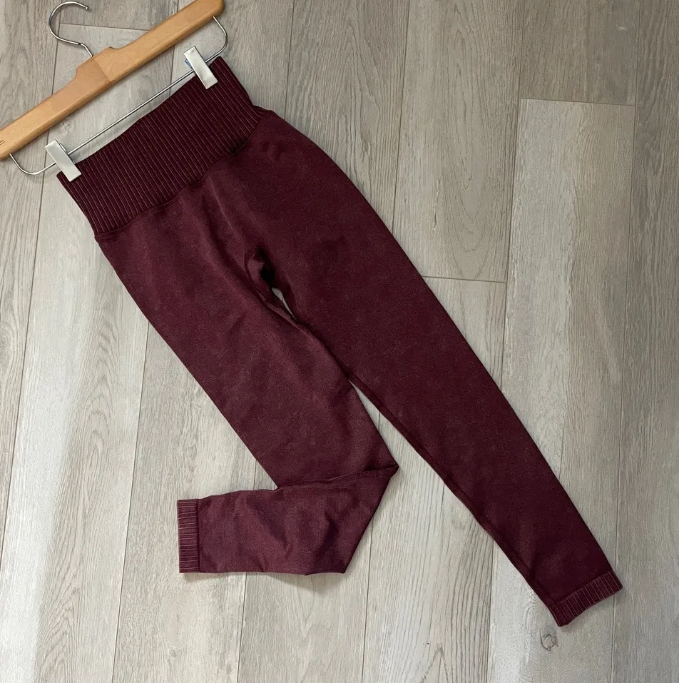 Popflex Sculpt Seamless Workout Leggings in the color Burgundy / red. High rise, ribbed detailing on wasitband, skinny leg. Stretchy, compressive fabric. SIze xsmall, womens. In great pre-worn condition, no major issues. Nylon, spandex. Perfect for workout, gym, activewear, yoga, pilates, outdoor, casual, everyday style. // D201, 8.1