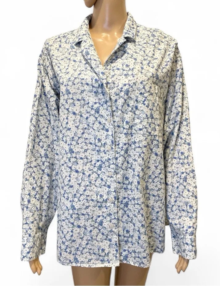 Excellent condition Size L Long sleeve buttons cuffs Patch pocket at chest Relaxed fit Notch collar Pit to pit 26.5” Length 26” Machine wash 100% cotton Embrace elegance with this floral blue women's top. Perfect for any occasion, this top combines style and comfort effortlessly. A36