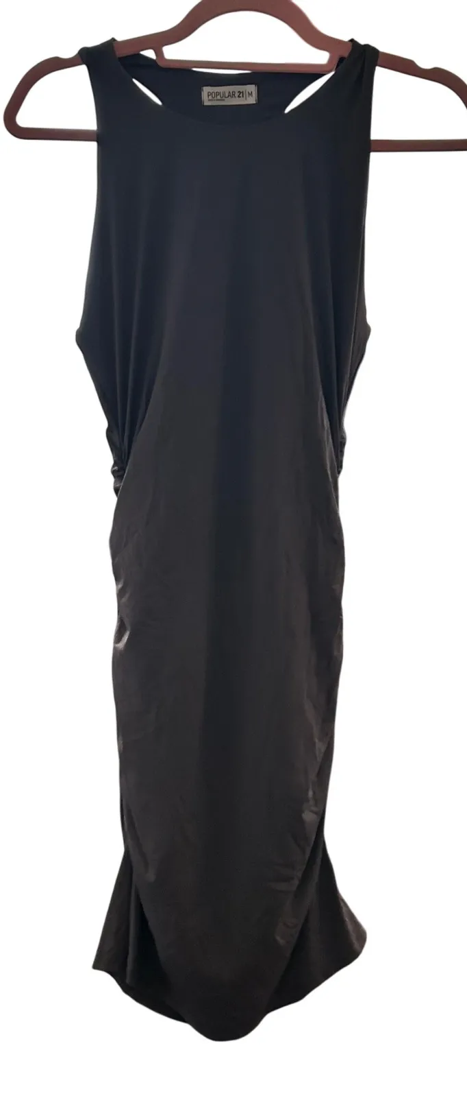 Sleek black midi dress, perfect for adding a touch of effortless cool to your wardrobe. This sleeveless dress features a flattering bodycon silhouette with chic ruching along the sides, offering a comfortable and stylish fit. The racerback design and soft fabric make it ideal for both casual and more dressed-up occasions. This versatile piece can be easily styled with sneakers for a relaxed daytime look or paired with heels for an evening out. Wear this dress to a casual brunch with friends, a summer concert, or a date night.