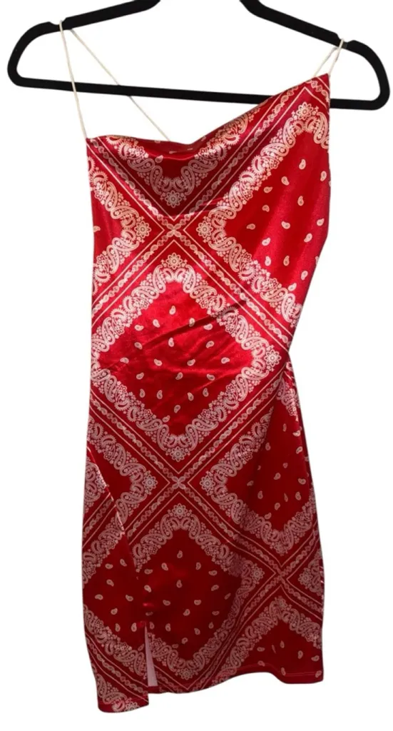 This is a Popular 21 women's mini dress in size S, featuring a red and white bandana print. The dress has a cowl neck design with thin, white spaghetti straps that cross in the back and lay asymmetrical on the shoulders It appears to be made from a satin-like fabric with a slight sheen. A small slit is visible on the left side near the hem. The garment is in new condition with no visible imperfections.