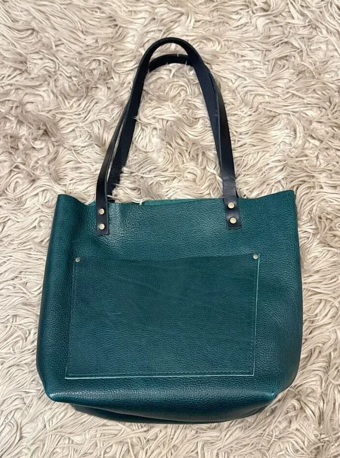 Portland Leather Goods Forest Green Pebbled Tote Bag with black handles NEW. Straight out of a mystery box and never used! Unicorn color! The leather smells AMAZING! Versatile bag that works with most outfits. 12” x 15”