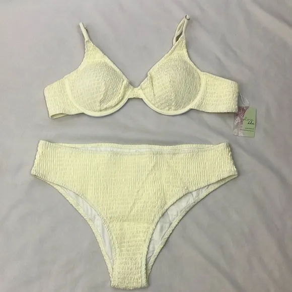 Poseshe butter yellow bikini set with a seersucker textured design. Perfect for beach days. • Poseshe bikini set • New with tags • Woman’s size 18 •Seersucker yellow bikini set • Padding • Adjustable straps #posesheswim #swim #pool #beach #bikini