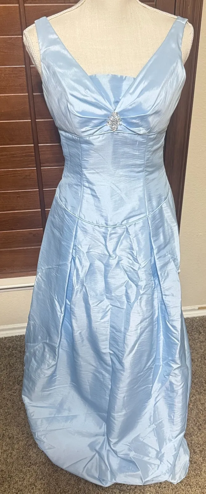 faint staining inside bodice as shown No holes or damage smokefree home Formal wedding bridesmaid sleeveless with rhinestone accent at bust zips in back three layer skirt boning at bodice marked size 10 but fits more like a 6 or 8 please compare measurements with a dress that fits you 47" length from center back to hem 17" pit to pit 14" across waist
