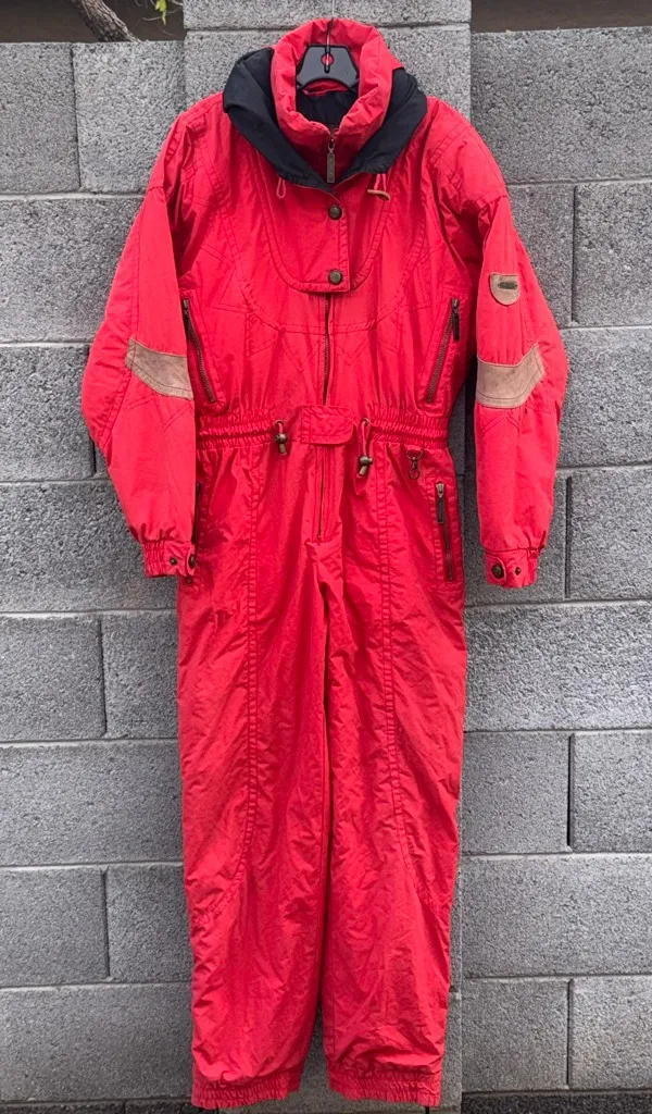This is a pre-owned women's Powderhorn ski and snow jacket in size 8, featuring a vibrant red exterior with black accents on the collar. The one-piece suit has a full-length zipper closure with a "POWDERHORN" branded pull tab, and additional snap buttons. It includes multiple zippered pockets, elasticized cuffs and waist, and brown leather-like patches on the shoulders and arms. The back features an embroidered "POWDERHORN" logo with mountain and floral designs. Visible wear includes some minor discoloration and small marks on the fabric. Please see picture for measurements for best size and fit. Vintage can run smaller.