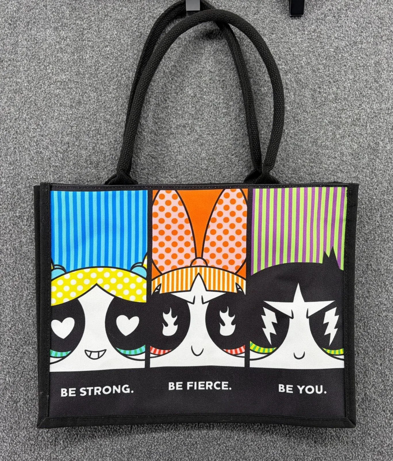 Fun Powerpuff Girls canvas tote bag featuring bold cartoon character graphics with the empowering phrases "Be Strong. Be Fierce. Be You." Designed with a roomy interior and sturdy shoulder handles, this tote is perfect for daily errands, books, markets, or casual carry. Details: • Brand: Powerpuff Girls • Style: Canvas Tote / Shopper Bag • Color: Black (multicolor graphic) • Print: Cartoon character graphic • Carry: Shoulder handles • Closure: Open top • Interior: Wipeable lining Material: • Canvas Condition: Excellent pre-owned condition. No holes, stains, or structural issues noted. Light general wear consistent with normal use. Measurements (approx.): • Width: 14" • Height: 11" • Depth: 6" • Handle drop: 9" Actual colors may vary slightly due to screen settings.