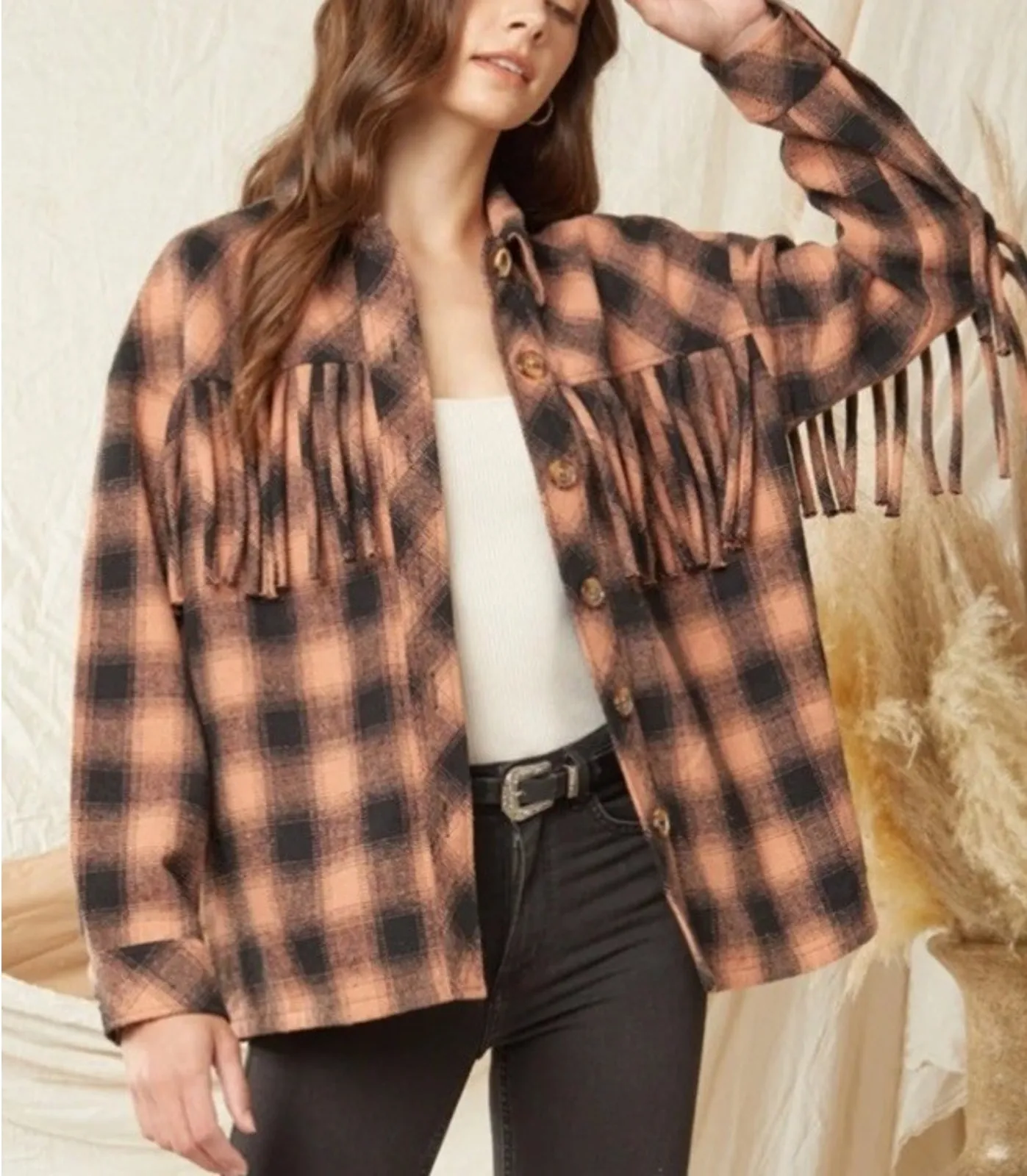 Entro Fringe Plaid Shacket, specifically in a desert clay and black buffalo plaid check pattern. Thi... Show more