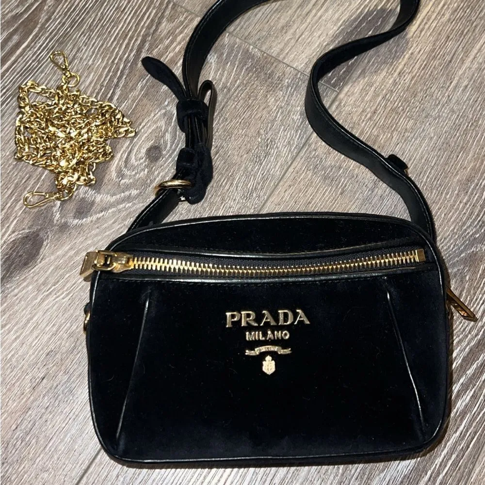 Pristine quality with no defects or alterations. Authentic Black velvet belt bag - PRADA Dimensions:... Show more