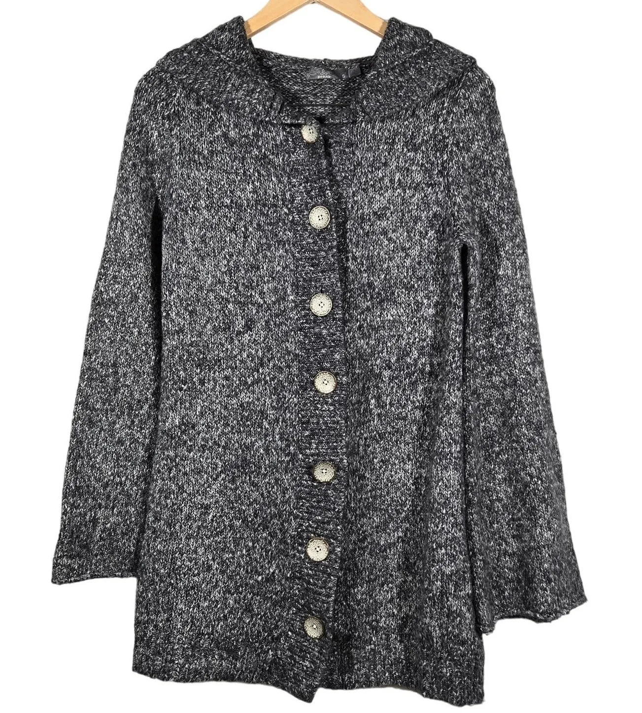 Tagged info: Size: S Material: 55% Cotton, 34% Acrylic, 10% Polyester, 1% Spandex Bell / flare sleeve Metal buttons Hood Long sleeve Button down Approximate measurements (laying flat): Chest: 17.5" Length: 30" Sleeve: 24.5" In great pre-owned condition with no known flaws and light overall wear. Keywords: Prana sweater, hooded cardigan, speckled knit, button front, women's knitwear, casual comfort, outdoor wear, versatile layering, cozy style, fall fashion, winter essential
