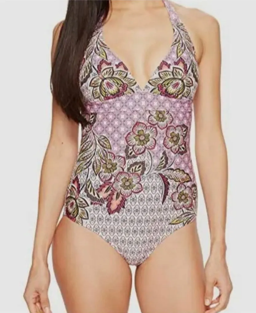 A one-piece suit for beach days and relaxing by the pool Supportive empire band with adjustable back hook Full rear coverage with back keyhole detail Moderate bust coverage with tied halter top Item #PRA00EA Excellent preowned condition! Bra pads not included. Size XL