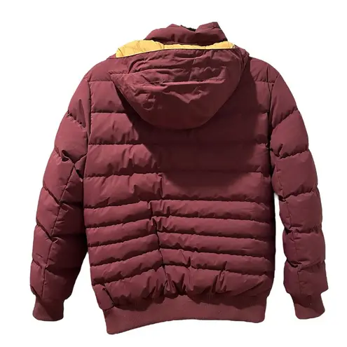 This Prana bomber jacket is in excellent like-new condition. It has a detachable (zippered) hood. It’s the bomb when it comes to cold, wet, snowy weather thanks to the perfect mid-weight insulation. Color: Maroon exterior, Mustard Yellow interior Size: Women’s Small Material:Shell: 100% recycled polyester;Lining: 100% recycled nylon. This low fill jacket comes with a Reverse coil center front zipper, Zip entry hand pockets lined in micro fleece, interior security zip pocket, and embossed leather zipper pull tabs. Wordmark embroidery logo. Style# 124977 All items ship within 1-2 business days!!
