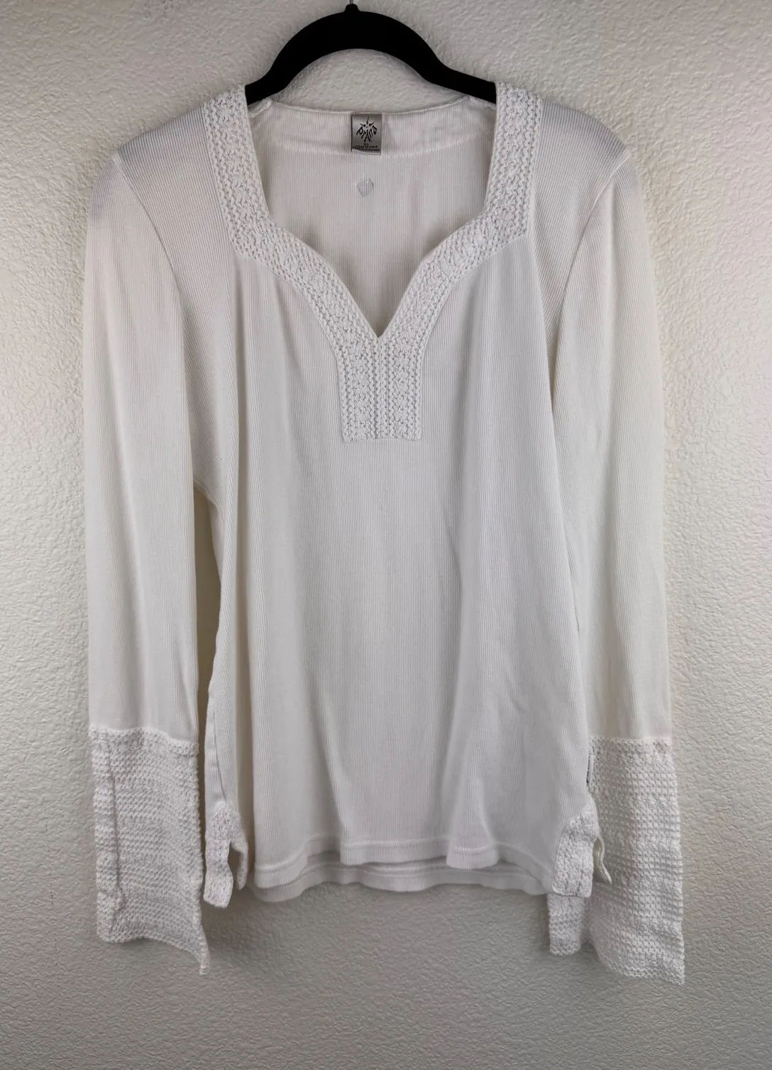Measurements: • Pit to Pit: 19 in • Length: 24 in Type: T-Shirt Department: Women Style: Tunic Material: 100% Cotton, Linen Blend, Viscose Neckline: V-Neck Sleeve Length: Long Sleeve Sleeve Type: Flared Sleeve Pattern: Solid Accents: Crochet Features: Lightweight, Stretch Keywords: Prana top, women's top, white top, knit top, crochet trim, V-neck, long sleeve, casual top, organic cotton, size XL, boho, resort wear, loungewear, comfortable, breathable Offers welcome! Fast Shipping!