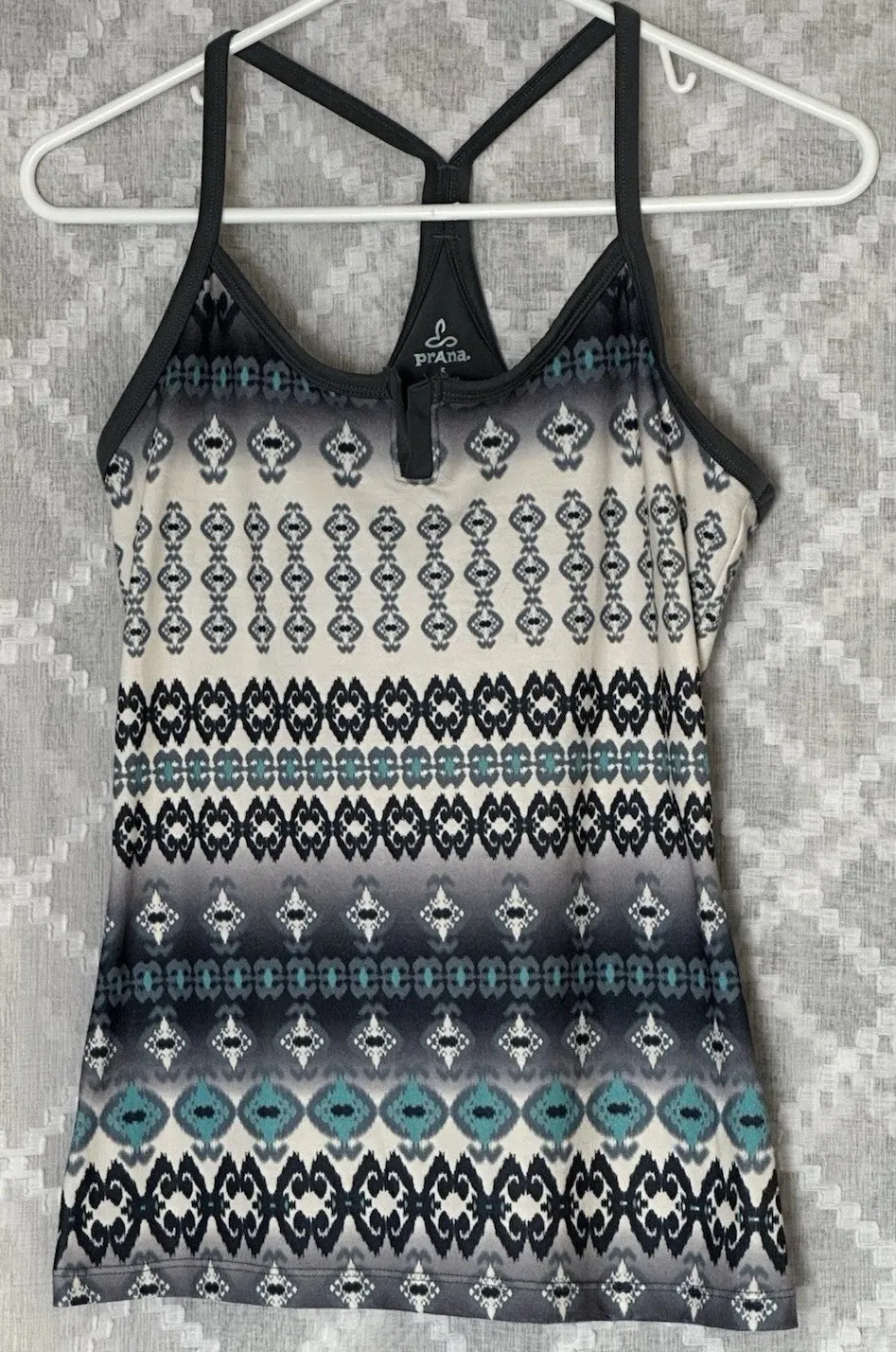 Sleek, lightweight prAna tank with a strappy racerback and earthy tribal-inspired print. Stretchy, breathable, and perfect for yoga, hiking, travel, or everyday athleisure wear. Aesthetic: Granola girl / boho active / outdoor yoga Details: • Strappy racerback • Stretch performance fabric • Fitted silhouette • Neutral gray, black & teal pattern Measurements: Chest: 16" Length (underarm to hem): 18" Condition: Good condition. No major flaws noted. #granolagirl #bohoactive #yogatank #outdoorwear #athleisure