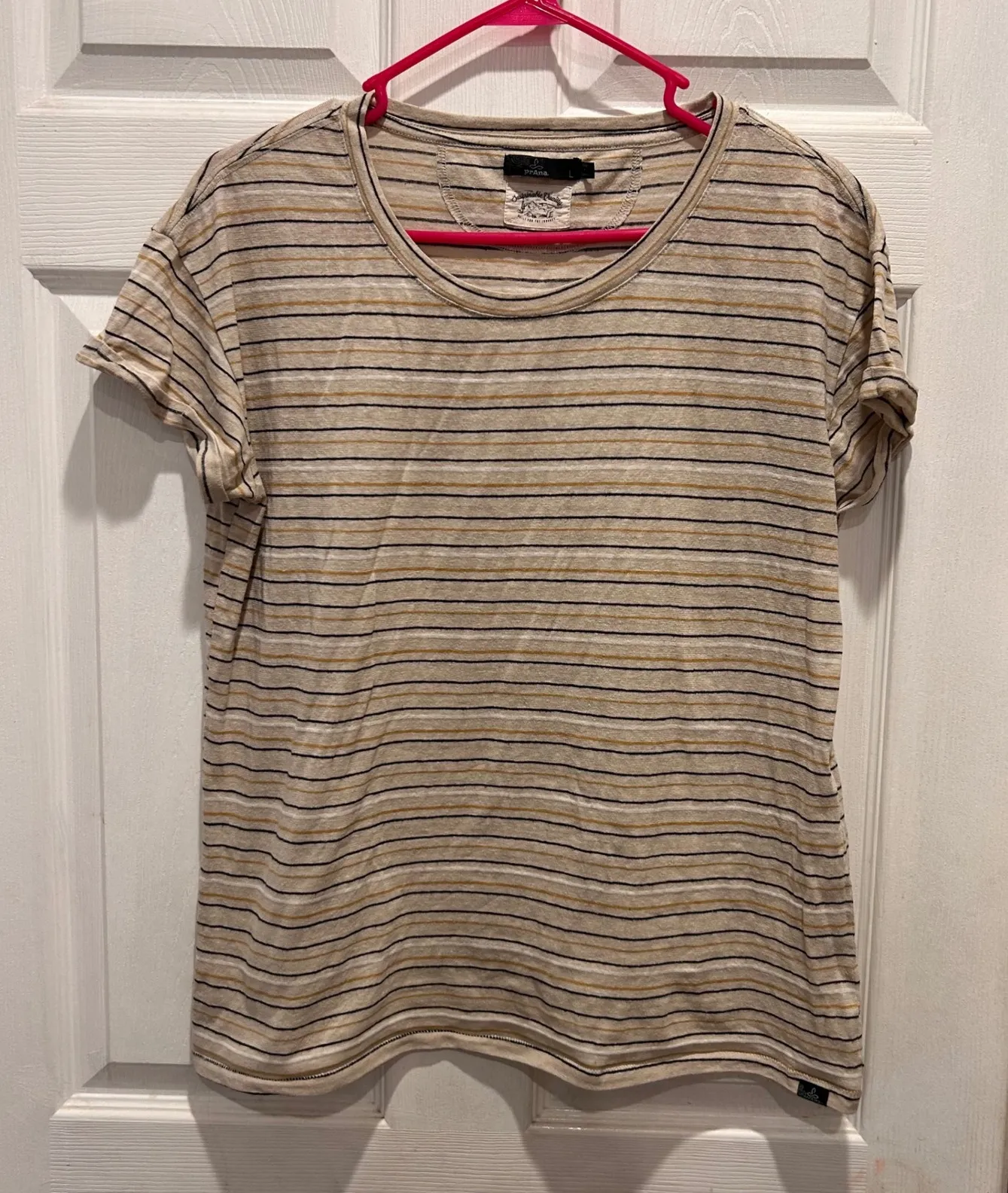 Great pre owned condition. No rips or stains. Minor washwear. UA to UA 22" Length 25.5" Measured flat and approximate Type: T-Shirt Department: Women Style: Basic Neckline: Crew Neck Sleeve Length: Short Sleeve Sleeve Type: Cap Sleeve Pattern: Striped Features: Breathable Fit: Regular Keywords: prAna, striped tee, casual wear, short sleeve, crew neck, cotton blend, womens top, everyday, comfortable, basic, outdoor, athleisure