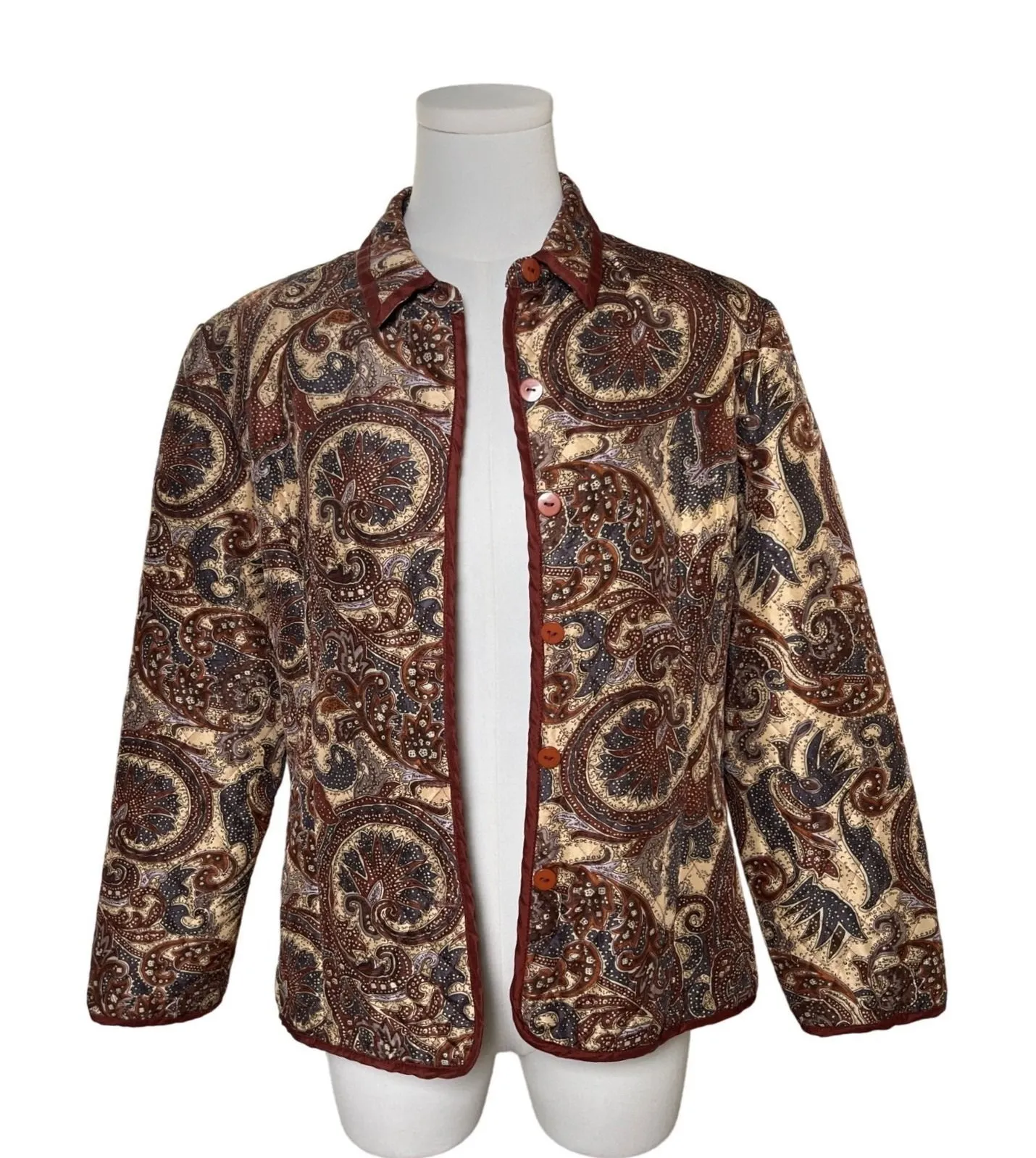 Size: Petite Large Color: Rust, Espresso Brown, Muted Navy, and Ivory with Brick-Red Trim Material: 100% Silk Shell, Acetate Lining Condition: Good vintage condition — light overall wear, no major flaws noted. Clean and fully lined. Bust 21 inches Length 22 inches Stylecore Vibes Heritage bohemian meets quiet luxury. The warm autumn palette and quilted silk texture make this perfect for fall layering — pair with denim, turtlenecks, or a silk scarf for an artful, global look. Details & Fit • Quilted silk shell with allover paisley print • Rust satin trim and matching buttons • Lightweight yet structured silhouette • Approximate size: Petite Large (fits close to a modern Medium-Large) Silkland jacket, quilted silk coat, paisley print blazer, vintage silk outerwear, boho fall jacket, quiet luxury layering, rust brown quilted topper, heritage style, art teacher aesthetic, classic paisley silk