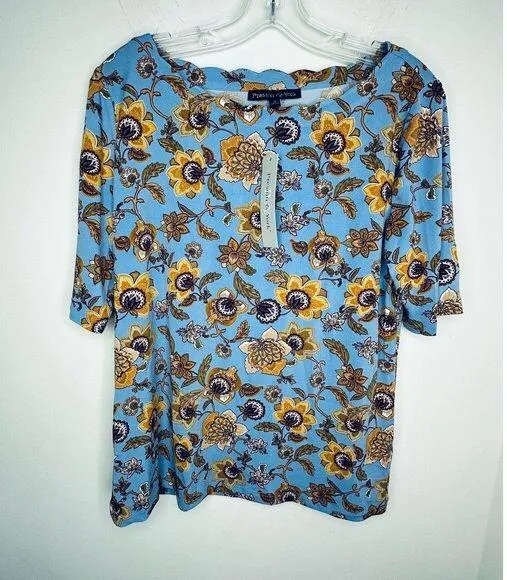 **Preston & York Floral Shirt - Size Small, New with Tags** Elevate your wardrobe with this stunning Preston & York floral shirt in size small, brand new with tags. Crafted from a blend of 95% polyester and 5% elastane, this shirt offers a comfortable fit with a touch of stretch for all-day wear. The vibrant blue and gold color palette features a beautiful floral pattern, perfect for adding a pop of elegance to your casual or semi-formal outfits. The scalloped neckline adds a delicate, feminine touch to this stylish piece. Don’t miss out on this chic and versatile addition to your closet! **Details:** - Brand: Preston & York - Size: Small - Condition: New with tags - Material: 95% Polyester, 5% Elastane - Colors: Blue/Gold - Design: Floral with scalloped neckline