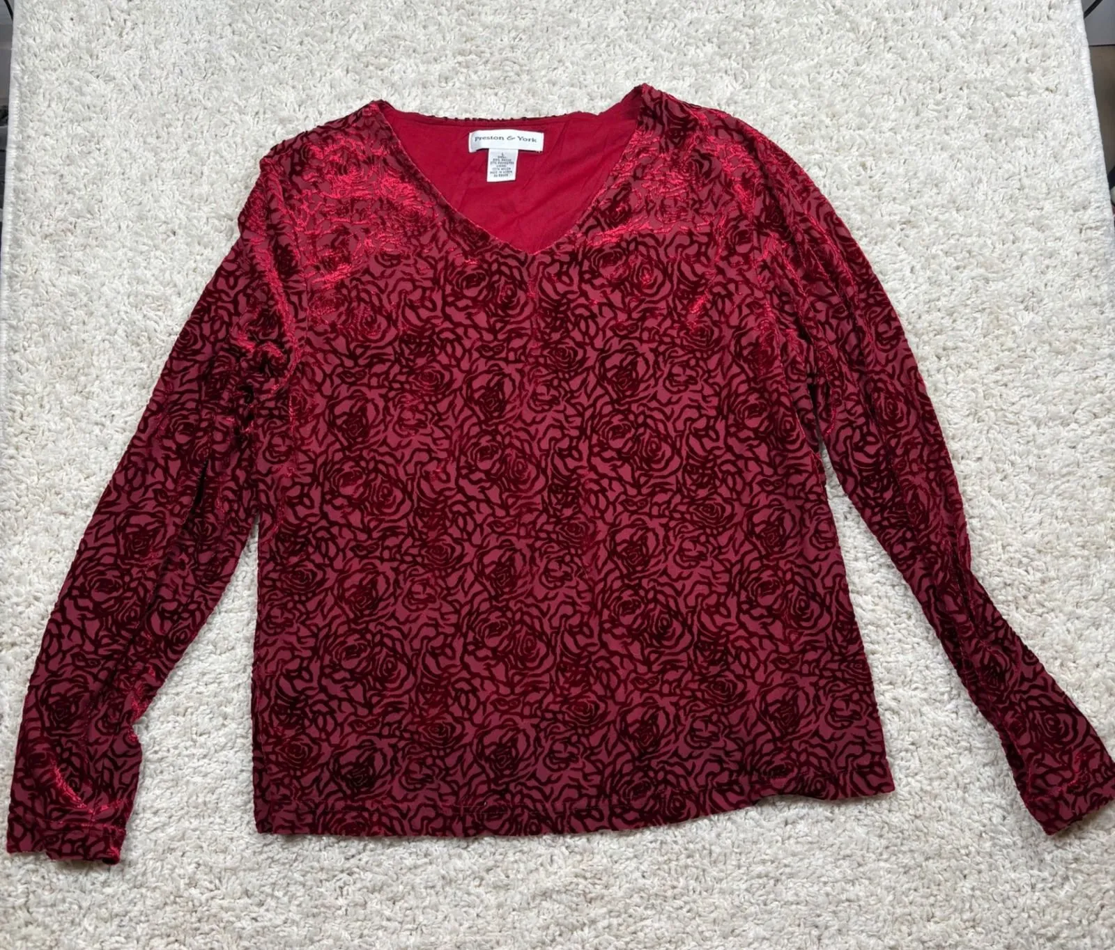 Adorn yourself in the opulent beauty of this Preston & York burnout velvet top. The rich red hue is illuminated by a captivating allover rose pattern, creating a visually stunning effect that feels both romantic and sophisticated. Its velvety texture invites touch, promising a luxurious feel against your skin, while the long sleeves offer elegant coverage. The flattering V-neckline adds a graceful touch, making this piece perfect for a romantic dinner or a festive evening out. Measurements: • Bust: 20 in • Length: 24 in • Waist: 19 in • Sleeve Length: 23 in Type: Blouse Department: Women Style: Basic Material: Rayon, Polyester, Nylon Neckline: V-Neck Sleeve Length: Long Sleeve Sleeve Type: Classic/Fitted Sleeve Pattern: Floral Theme: Flower Features: Lined Fit: Classic Fabric Type: Velvet Occasion: Casual, Party/Cocktail Closure: Pullover Season: Fall, Spring, Winter Keywords: velvet top, rose print, burnout velvet, red top, long sleeve, v neck, romantic, elegant, sophisticated, evening wear, date night, holiday, feminine, luxurious