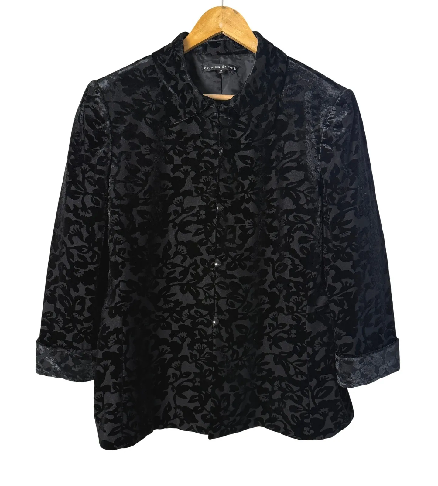 Vinatge Preston & York black blazer jacket with an allover floral burnout velvet pattern. This elegant jacket features a collared neckline, button-front closure, and cuffed sleeves. The luxurious velvet texture and intricate floral design make this a sophisticated layering piece for dressy occasions or a stylish accent to elevate everyday outfits. Perfect for a dinner out, a holiday party, or a theatrical performance. Approx. Flat Measurements: Bust (P2P): 23" Waist: 21" Length (shoulder to hem): 26" Type: Jacket Outer Shell Material: Velour Style: Basic Jacket Department: Women Lining Material: Polyester Accents: Button Features: Collared, Shoulder Pads Fabric Type: Velvet Pattern: Floral Season: Fall, Winter, Spring Closure: Button Occasion: Casual, Party/Cocktail Sleeve Length: 3/4 Sleeve Keywords: velvet blazer, burnout floral, evening jacket, statement piece, sophisticated, elegant, party wear, formal, luxury, womens fashion, textured, special occasion