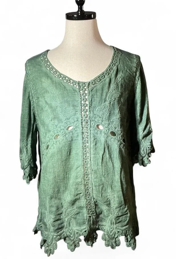 A charming green tunic top from Pretty Angel adorned with intricate embroidery and delicate lace trim. This piece features a flattering v-neckline with a button-down front and 3/4 sleeves. The eye-catching cutouts and scalloped hem add a touch of bohemian flair. Perfect for a casual day out, a beach vacation, or a relaxed brunch. Keywords: boho, embroidered, lace trim, green tunic, 3/4 sleeve, scalloped hem, cutout detail, casual wear, vacation wear, festival style, feminine, lightweight, bohemian chic All clothing are cross posted, #Casual #Festival #Handmade #Retro #Beach
