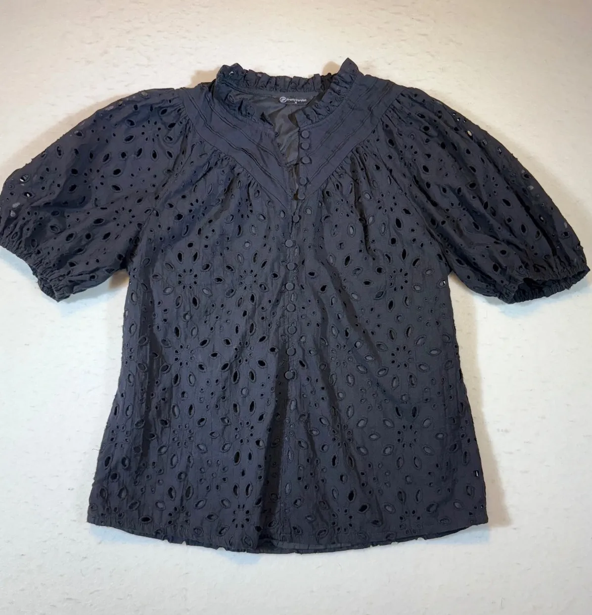 A black eyelet puff sleeve blouse with a ruffled high neck and button-up front. This stylish top showcases intricate eyelet detailing throughout the body and dramatic puff sleeves. The ruffled collar and button accents add a touch of feminine charm, making it perfect for a garden party, a casual brunch, or a romantic dinner. Type: Blouse Department: Women Material: 100% Cotton Neckline: High Neck Sleeve Length: Short Sleeve Sleeve Type: Puff Sleeve Pattern: Solid Accents: Button, Ruffle Theme: Peasant, Bohemian Features: Eyelet Keywords: Pretty Garden, Black Blouse, Eyelet Top, Puff Sleeve Shirt, Ruffled Neckline, Button Up Blouse, Women's Fashion, Bohemian Style, Feminine Top, Short Sleeve Blouse, Summer Top, Spring Fashion, Party Attire, Casual Chic