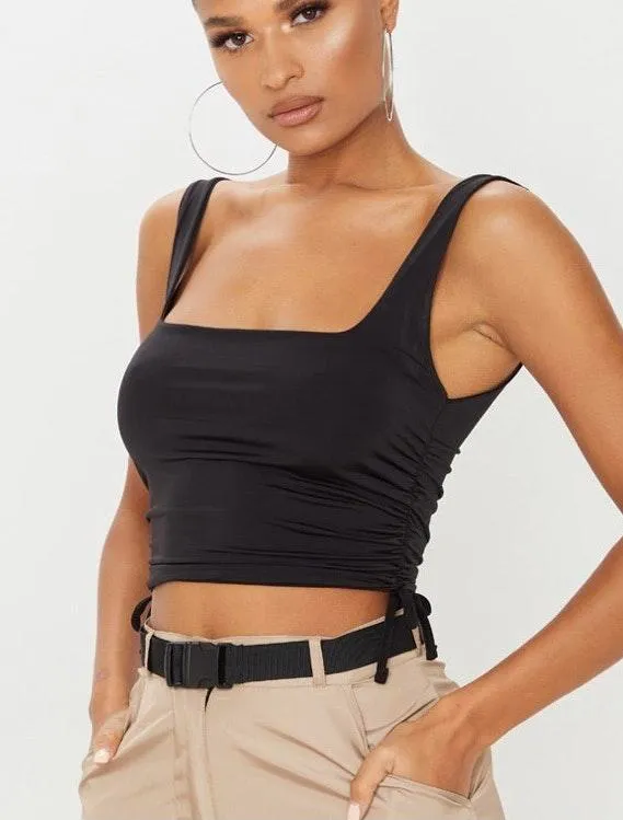 Super cute and soft cropped black tank top with ruching on the side. Only worn once. Bought on here... Show more
