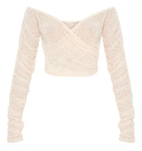 Never worn, new with tags, nude dobby mesh runched sleeve bardot crop top. US-6 and UK-10! Super cut... Show more