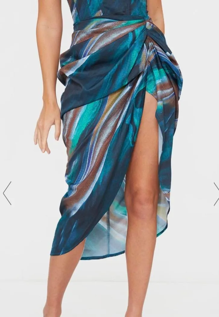 High Slit turquoise marble print fabric with ruched side detailing, just add the matching corset top... Show more