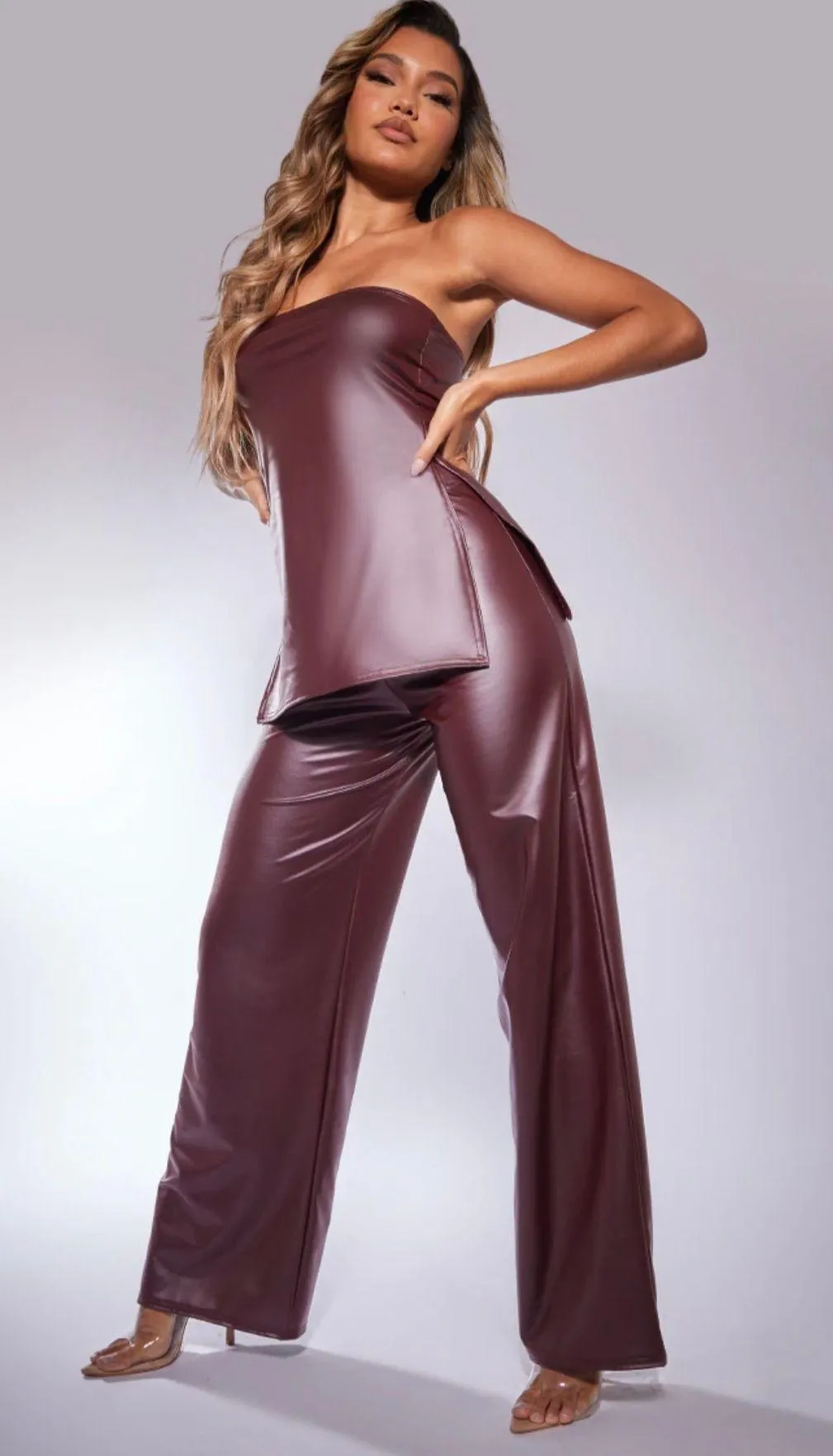Worn once only- pretty little thing faux leather bandeau and high waist wide leg pants.