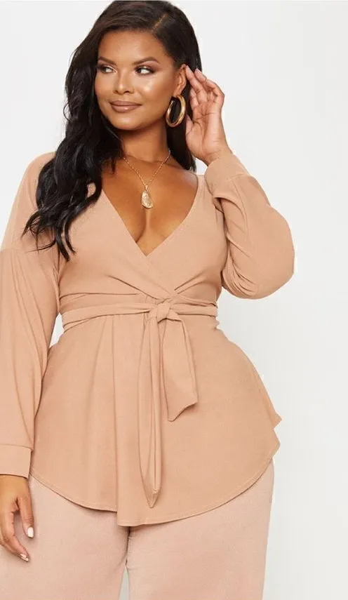 NEW Prettylittlething Plus Camel Tie Waist Blouse Women’s 14 Measurements- Pit to Pit: 15in Shoulde... Show more