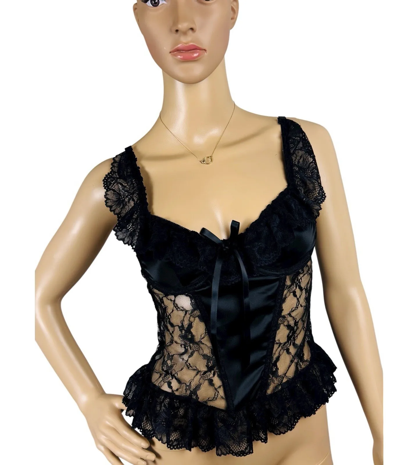The NWT PrettyLittleThing Black Lace Corset Top in size 2 features a hook and eye closure, making it... Show more
