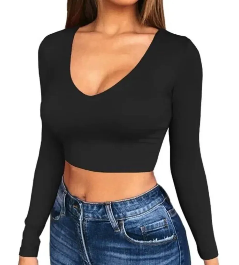 NWT PRETTYLITTLETHING BLACK LONG SLEEVE V CUT CROP TOP US4 FABRIC LIKE SECOND SKIN