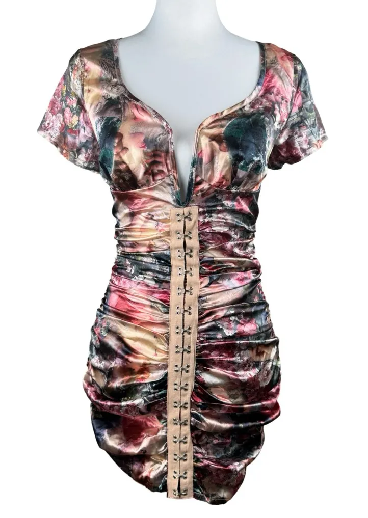Gorgeous multi-colored satin body con dress! Beautiful floral print and ruching V bar wire front at... Show more