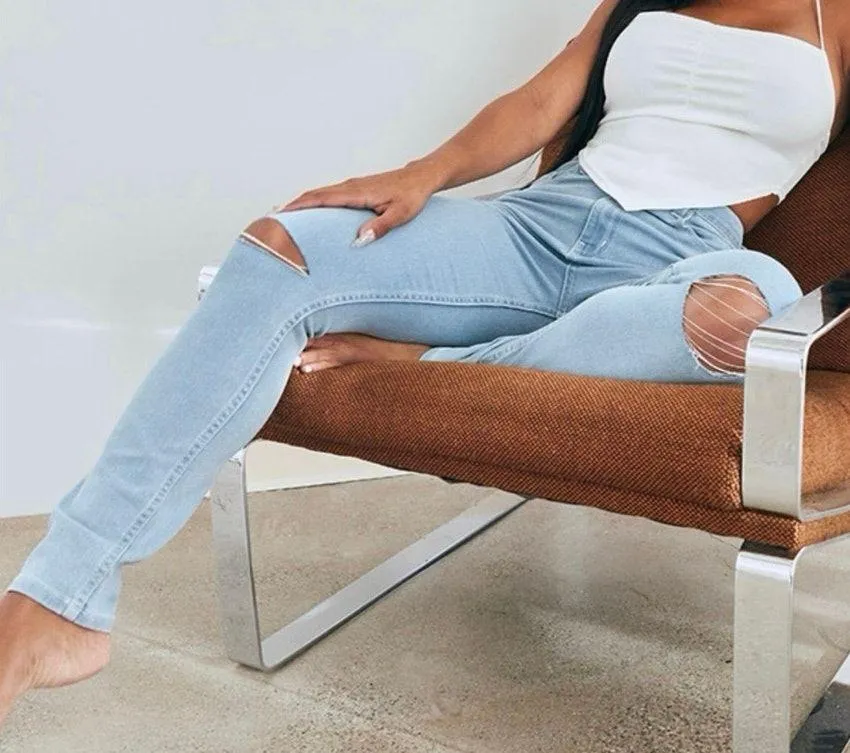 Light blue wash denim Ripped knee details Skinny fit High waist Stretch cotton blend fabric 68% Cott... Show more