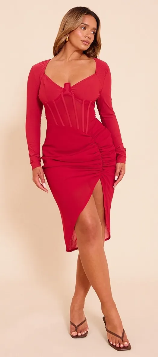 Keywords: PrettyLittleThing dress, red midi dress, corset dress, ruched dress, long sleeve dress, bodycon dress, party dress, cocktail dress, evening dress, date night dress, size 4 dress, size 8 dress, red dress, PLT dress, hoco, homecoming, valentines day, Christmas, holiday party