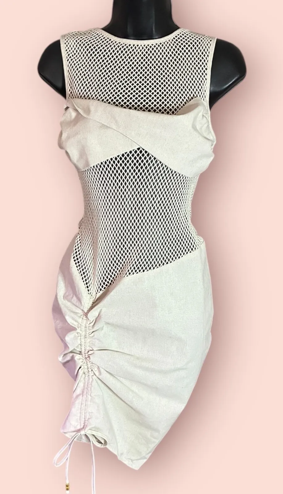 Keywords: mini dress, bodycon dress, ruched dress, sleeveless dress, party dress, club dress, beige dress, cream dress, plt label, going out dress, cocktail dress, mesh dress, summer dress