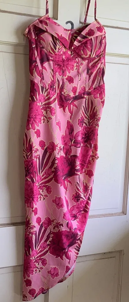 So lovely with left side hemline rising high up the leg. Adjustable straps and boned bodice. Gently... Show more