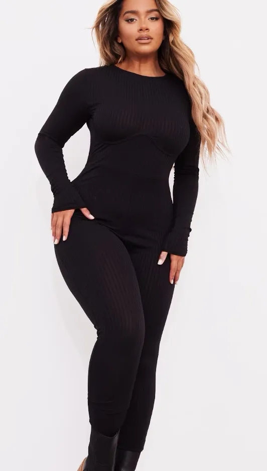 Stylish black ribbed jumpsuit with long sleeves. Perfect for a sleek look.
