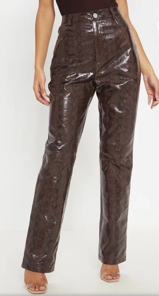 PrettyLittleThing Brown Faux Leather Snakeskin Straight Leg Pants. Take your weekend look to the nex... Show more