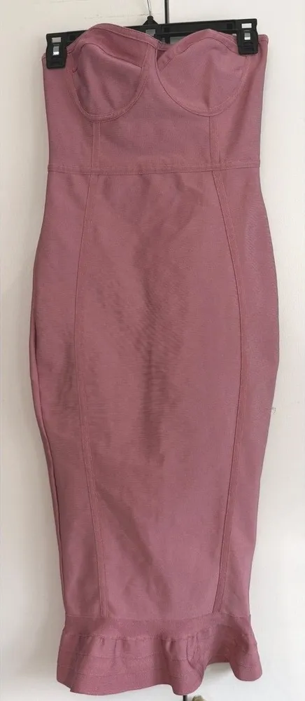 Keywords: prettylittlething dress, pink midi dress, strapless dress, bodycon dress, ruffle hem, fishtail hem, cocktail dress, evening dress, date night dress, party dress, special occasion, glamorous, feminine