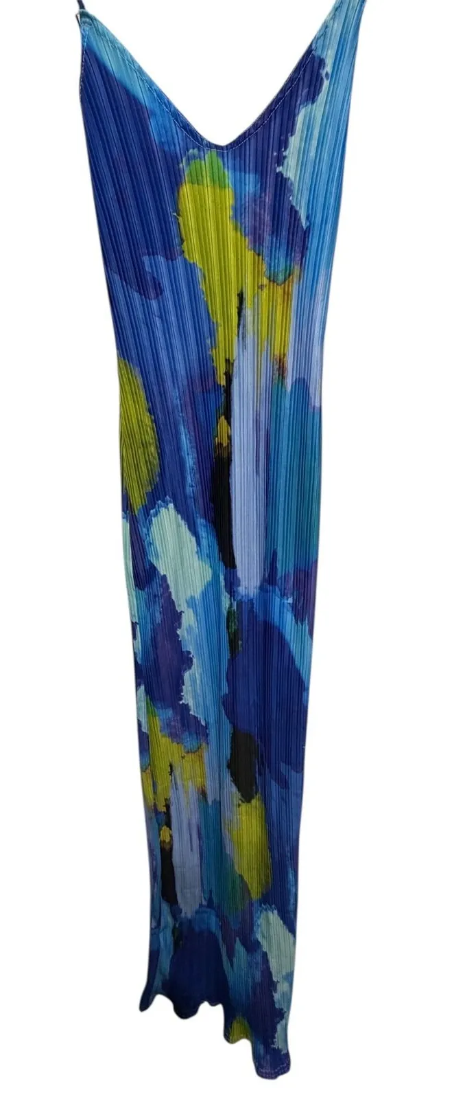 Capture attention in this stunning pleated maxi dress, designed to make you feel effortlessly chic. The vibrant abstract print bursts with shades of blue and yellow, creating a captivating visual appeal that is sure to turn heads. Delicate spaghetti straps and a flattering V-neckline complement the flowing silhouette, while the unique pleating adds a touch of sophisticated texture and movement. This dress is perfect for a summer wedding guest look, a stylish vacation evening, or a vibrant brunch with friends.