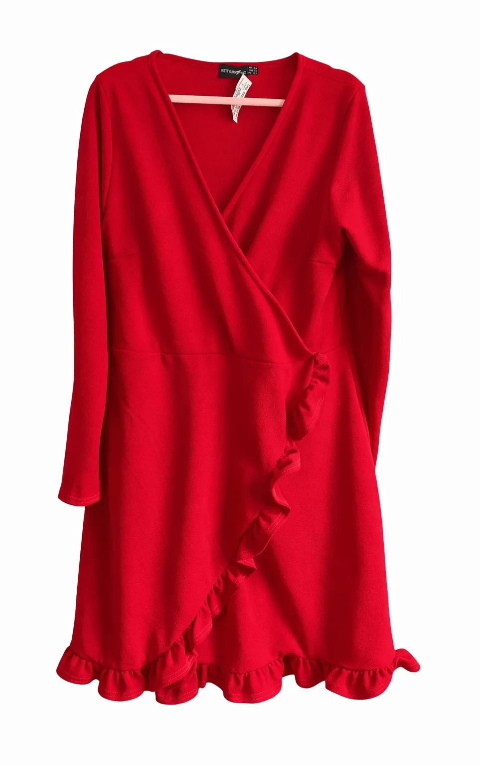PrettyLittleThing dress, PLT red dress, PLT size 20, red ruffle dress, wrap front dress, Valentine's Day dress, plus size red dress, flirty ruffle trim dress, party dress, long sleeve wrap dress, new with tags dress