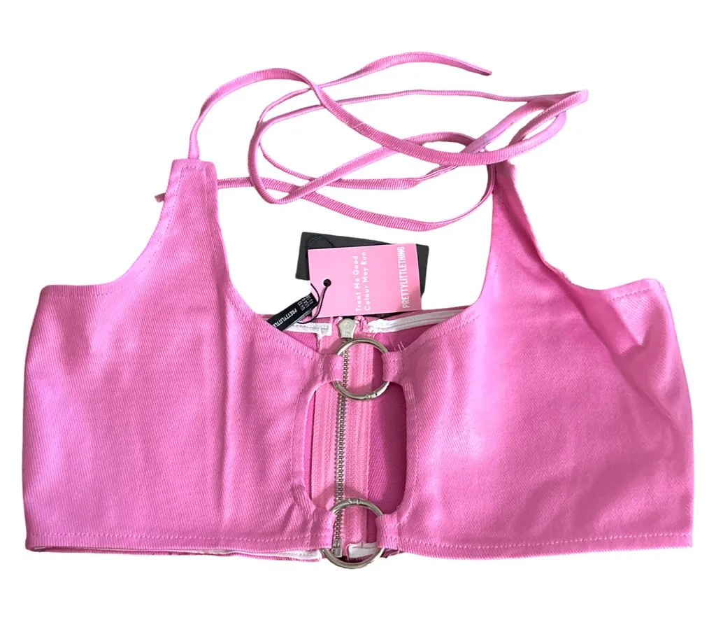 Color: Pink • Neck tie • Halter crop • Zipper in the back • 100% Cotton Stylish pink bralette featur... Show more